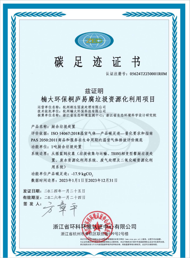 桐廬易腐垃圾處置項(xiàng)目碳足跡證書